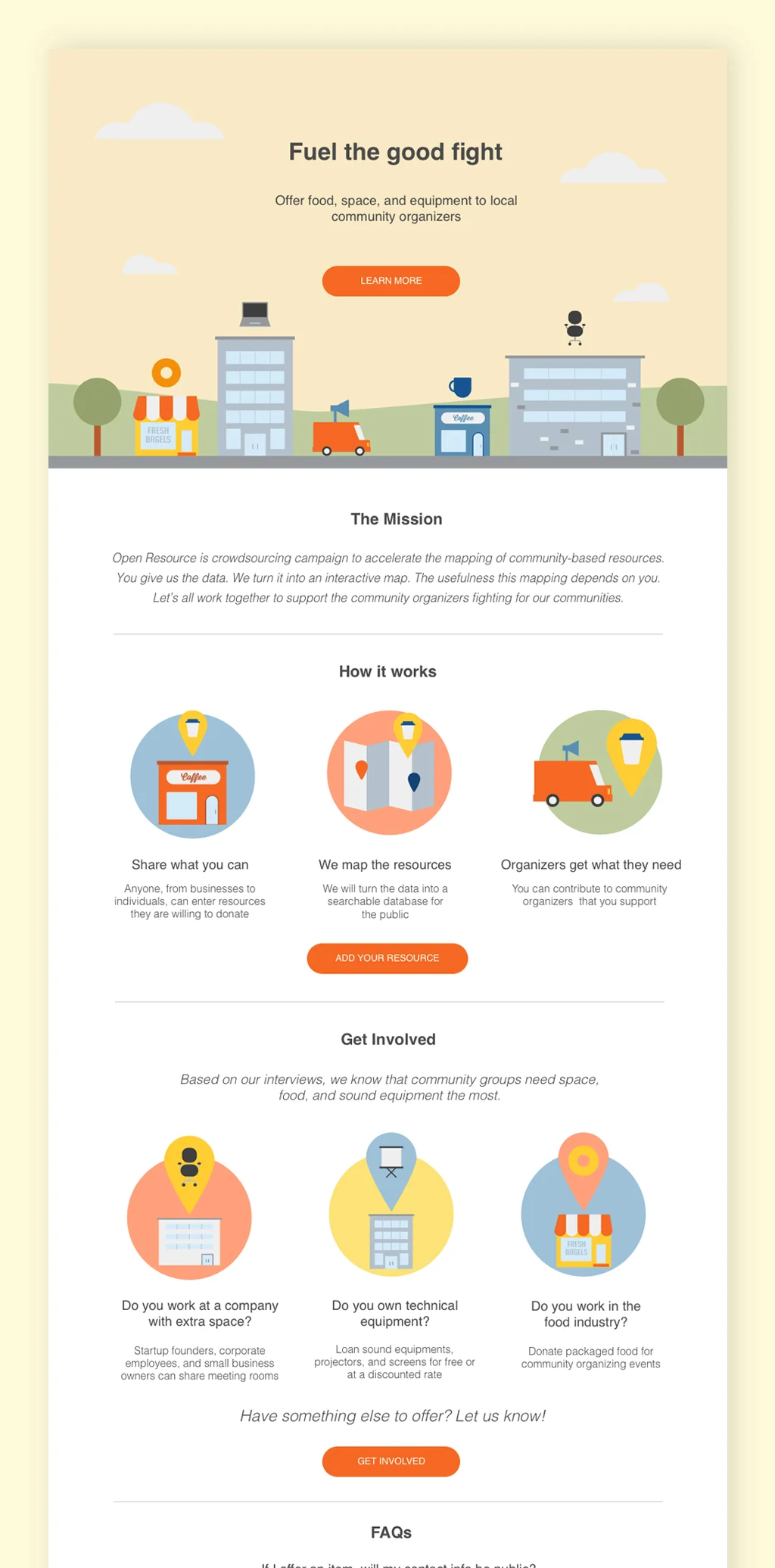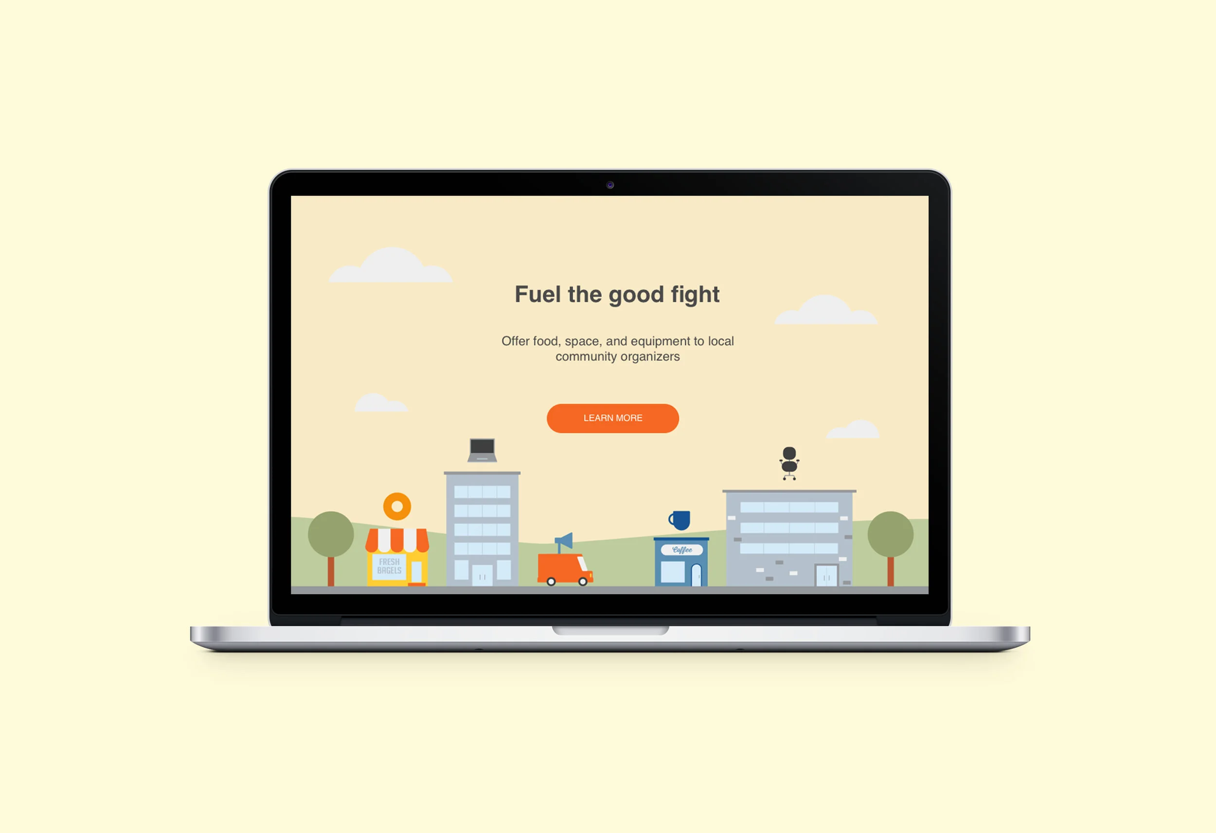 Sponsorlane, an early-stage Bay Area startup needed a landing page for their new campaign, Open Resource. The Open Resource project allows businesses, organizations and individuals to contribute space, food and equipment to support community organizers. The Sponsorlane team didn't want to use protest photography that they used for the first iteration of the landing page. They wanted to steer clear from using political colors and make the landing page feel positive and motivating through simple illustrations. I started the ideation process by sketching things that came to mind from the phrase "fueling the good fight."